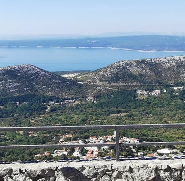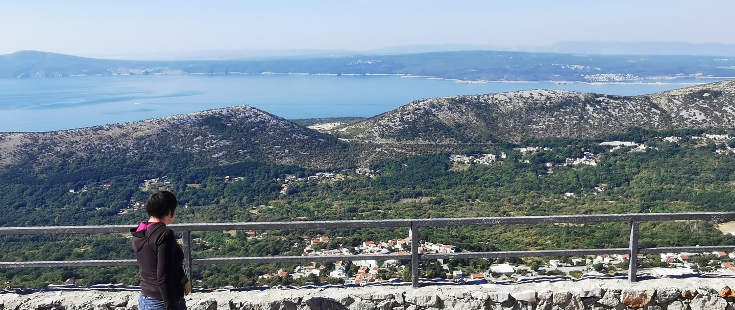 Tokrat se v Fužinah nisem ustavil. Sara je v avtu spala, potrebe po polnjenju Konine baterije pa tudi ni bilo. Prvi postanek je bil na razgledišču Slipica nad Selcami, ki odpira lep pogled na mesto Bribir pod strmo pečino in Vrbnik ter Šilo na Krku. Med zobanjem bučnih paličic sva se naužila razgleda in se podala naprej proti Krasnemu, kjer je tudi sedež NP Severni Velebit.