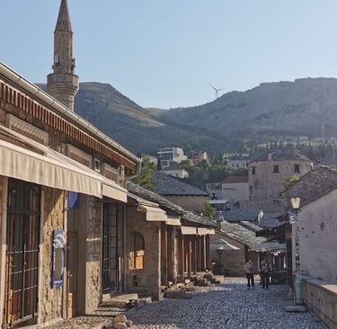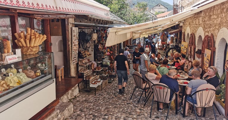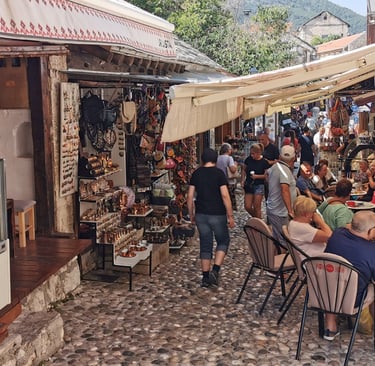 Še pred osmo uro zjutraj so prvi ulični prodajalci začeli odpirati svoje prodajalne in pogledovati za kupci. Na ulice so se selila stojala, klopi in obešala s številnimi bolj ali manj lokalnimi izdelki domače obrti, pa tudi turškim in morda še bolj vzhodnim tekstilom, torbicami in podobnim. Seveda so prednjačile bakrene džezve in drugi uporabni ter okrasni predmeti iz te barvne kovine. Neokusnega kiča je bilo razmeroma malo. Ustavila sva se v lokalu ob reki. Ob toplih napitkih sem lahko izkoristil njihov WiFi in postoril najnujnejše. Še družinski Viber klepet in že naju je neslo naprej. V BiH so telekomunikacijske storitve v gostovanju precej drage. Minuta pogovora npr. stane do 3€, zato sem telefon degradiral iz pametne naprave v fotoaparat.