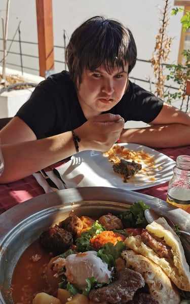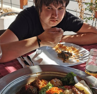 Proti poldnevu so bile ulice že živo nasprotje jutranjemu mrtvilu. Kar bleščalo se je od spominkov in uporabnih izdelkov. Vsakih nekaj deset metrov so zadišale zelenjavne in mesne dobrote z žara. Nasmejana in urejena dekleta so na ulicah z jedilnimi listi vabila v svojo restavracijo na kosilo. Naključno sva izbrala eno in na terasi z lepim razgledom naročila mešano ploščo tradicionalnih lokalnih jedi. Natakar je sicer omenil, da je plošča za dva, a sva bila sita, še preden sva pospravila polovico. Zelo okusno, a preveč. Ostanek je preložil v alu posodico za kasneje.