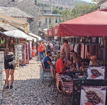 Pred časom sem prebral kar nekaj potopisov, ki opisujejo izkušnje v Mostarju. Večinoma so poudarjali nizke cene za evropskega turista. Drži, cene so precej, na oko bi rekel pol nižje kot pri nas. Neskromna porcija z žara, zelenjavna ali mesna s prilogo v lokalih stane povprečno 3,5€, kava do največ 1€. Spominki so poceni, magnetki npr. 1€. Malo dražja so ročna dela, bakrene džezve od 10 do 30€, odvisno od velikosti in dodelave. Kuhati med večdnevnimi počitnicami v Mostarju skoraj nima smisla ob takih cenah, razen morda za večje družine ali skupine. Celo bolj nobel restavracije ne pretiravajo s cenami. Prej omenjeno kosilo me je olajšalo za pribl. 20€ s pijačo vred, hrane pa je ostalo še za en tak obrok. Na tržnici sem kupil 4 kozarce medu, ki se je prodajal po pol nižji ceni kot pri nas. Seveda sem prej preveril, kolikor se je dalo, ali je med pravi. Je pa kupovanje medu tvegano, saj se zaradi zelo slabega nadzora prodaja precej ponaredkov, predvsem zdravju neprijaznih, močno sladkanih sirupov z dodatki.
