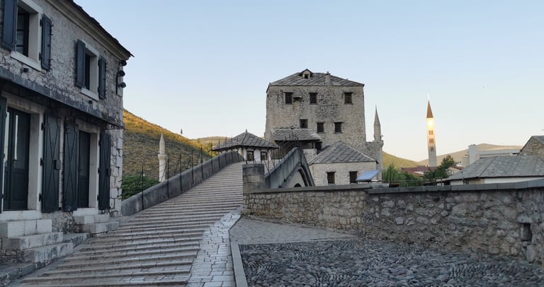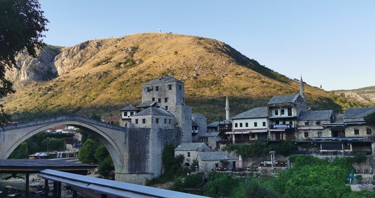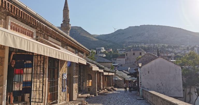 Ob treh zjutraj je bil pravi čas za nadaljevanje poti do Mostarja, saj sem želel tja priti pred šesto uro zjutraj, ko mesto še spi. Prispela sva ravno pred sončnim vzhodom, ko so zažareli najvišji vrhovi hribov nad mestom. Hitro sva našla parkirišče 200m od starega mosta in se sprehodila po povsem praznih, starih ulicah na obeh straneh reke. Moram priznati, da sem bil kljub visokim pričakovanjem pozitivno presenečen. Preprosta, skladna arhitektura, s kamnom lično tlakovana tla, lepo umeščeni lokali vrh dokaj globoke struge Neretve s pogledom na most in nasprotni breg. Mesto je bilo kot izumrlo z izjemo dveh komunalnih delavcev, ki sta z gasilskimi cevmi iz hidranta prala manjši trg z večjim odrom in bližnje ulice. Očitno je bilo prejšnjo noč precej veselo. Odprta je bila samo lokalna pekarna, kjer sva si za zajtrk privoščila velik kos pice in višnjevo pito, skupaj 1,2€.